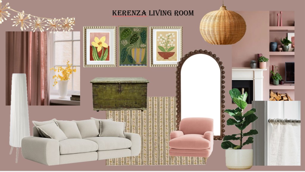A client’s living room redesign. The brief was pink! I worked in some contrasting pink tones, and some greens to bring the outside in.