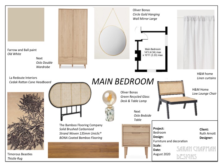 Bedroom presentation board for a clients new flat. There was a very specific brief for this room. Neutrals were very much the colour scheme to create a calming and relaxed space away from a lively toddler. We kept to budget with mainly high street pieces, and so were able to add a higher end rug from Timorous Beasties. Luckily the client’s favourite too.